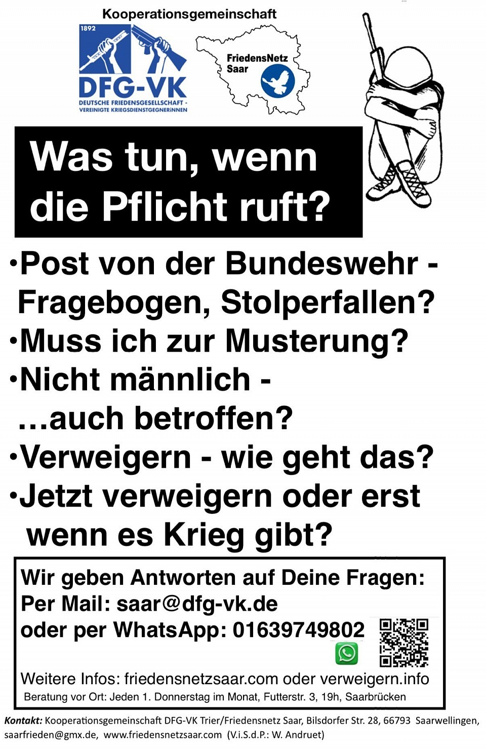 Das Friedensnetz Saar ist regionale Anlaufstelle für Menschen, die den Kriegsdienst verweigern wollen. Wir beraten oder vermitteln bei schwierigen Fällen weiter!