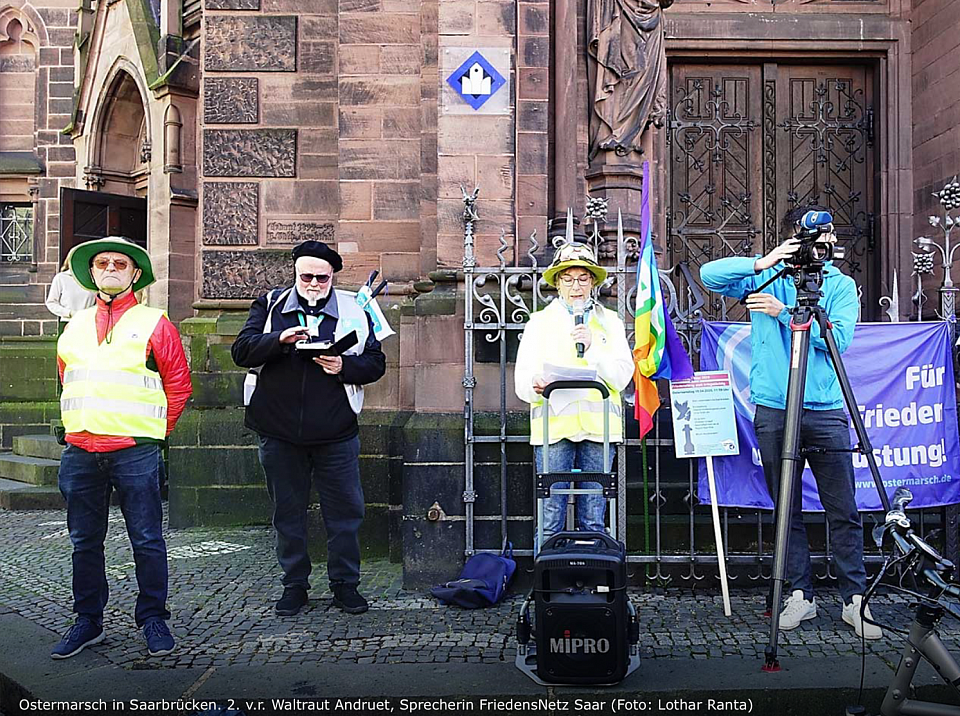 Saarbrücken – Am Karsamstag, dem 9. April 2025, fand in Saarbrücken der diesjährige Ostermarsch des FriedensNetz Saar statt. Nach Angaben der Polizei beteiligten sich rund 400 Menschen an der Demonstration – deutlich mehr als in den Vorjahren. Treffpunkt war um 11 Uhr an der Johanniskirche, von wo aus der friedliche Demonstrationszug unter dem Motto „Friedensfähig statt kriegstüchtig“ durch die Innenstadt zum St. Johanner Markt zog.Waltraud Andruet vom FriedensNetz Saar begrüßte alle Anwesenden sowie die unterstützenden Organisationen. In ihrem Aufruf warnte sie vor den aktuellen sicherheitspolitischen Entwicklungen: „Wir leben im gefährlichsten Jahrzehnt des Zweiten Weltkrieges. Wir stehen für eine friedliche Welt und gegen die zunehmende Militarisierung.“ Besonders das Saarland sei gefährdet „wegen der Rüstungsproduktion, durch die Nähe zum Atomwaffenstützpunkt Büchel/Eifel und zur Air-Base Ramstein.“