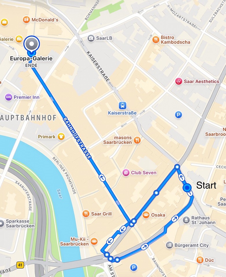 Johanneskirche-Dudweilerstr.-Rabbiner Rülf Platz-Gustav Regler Platz(Zwischenkundgebung)-Johanneskirche-Dudweilerstr.-Bahnhofstraße.-Europagalerie