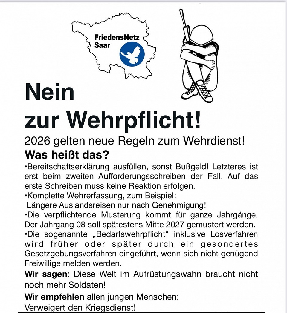 Das Gesetz zur Modernisierung des Wehrdienstes wurde am 5. 12. 25 im Bundestag beschlossen und ist vom Bundesrat bestätigt wurden.Folgende Kurzmeldung auf imi-online.de beschreibt den damit verbundenen aktuellen Sachstand über die ab 1.1.26 gesetzlich verbindlichen Regeln hinaus:".....vorerst soll es aber keine Dienstverpflichtung geben. In diesem Zusammenhang war besonders umstritten, ob es zu einer automatischen Re-Aktivierung der Wehrpflicht kommen soll, sollten die NATO Vorgaben die Personalgröße der Bundeswehr schrittweise von derzeit rund 180.000 auf etwa 260.000 Soldat*innen zu erhöhen, verfehlt werden („Bedarfswehrpflicht“). Auch hier scheint sich laut Spiegel Online die Union weitgehend durchgesetzt zu haben: Nun soll, wie der SPIEGEL aus Koalitionskreisen erfuhr, ein Korridor bis zum Jahr 2035 festgelegt werden. Wenn die Zahlen, die sich an den Verpflichtungen gegenüber der Nato orientieren, nicht erreicht werden, soll die Wehrpflicht wieder aktiviert werden. Allerdings soll der Beschluss dafür dem Vernehmen nach durch ein weiteres Gesetz herbeigeführt werden.“